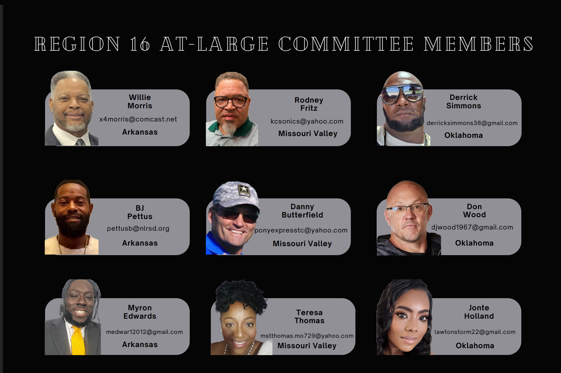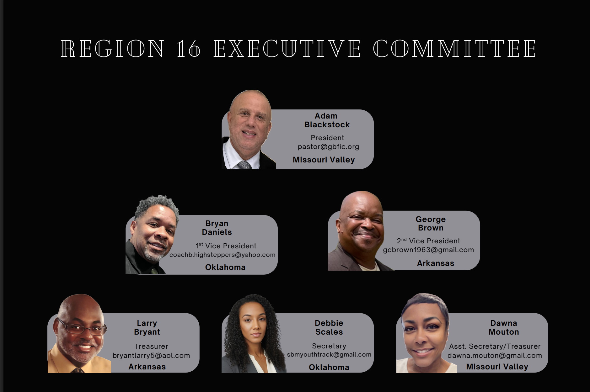 Region 16 Youth Athletics Association was started in October 2013. The original Officers were Bobby Carter, Chairman, Willie Morris Vice Chairman, & Andrea Troupe, Secretary/Treasury. The committee also included a total of 6 At-large members & 2 Event Coordinators. The primary function of this committee is to provide planning and the implementation of the Track & Field & Multi Events Regional Qualifier meet of the 4-state area of Arkansas, Kansas, Missouri, & Oklahoma for youths ages 5-18 years old.